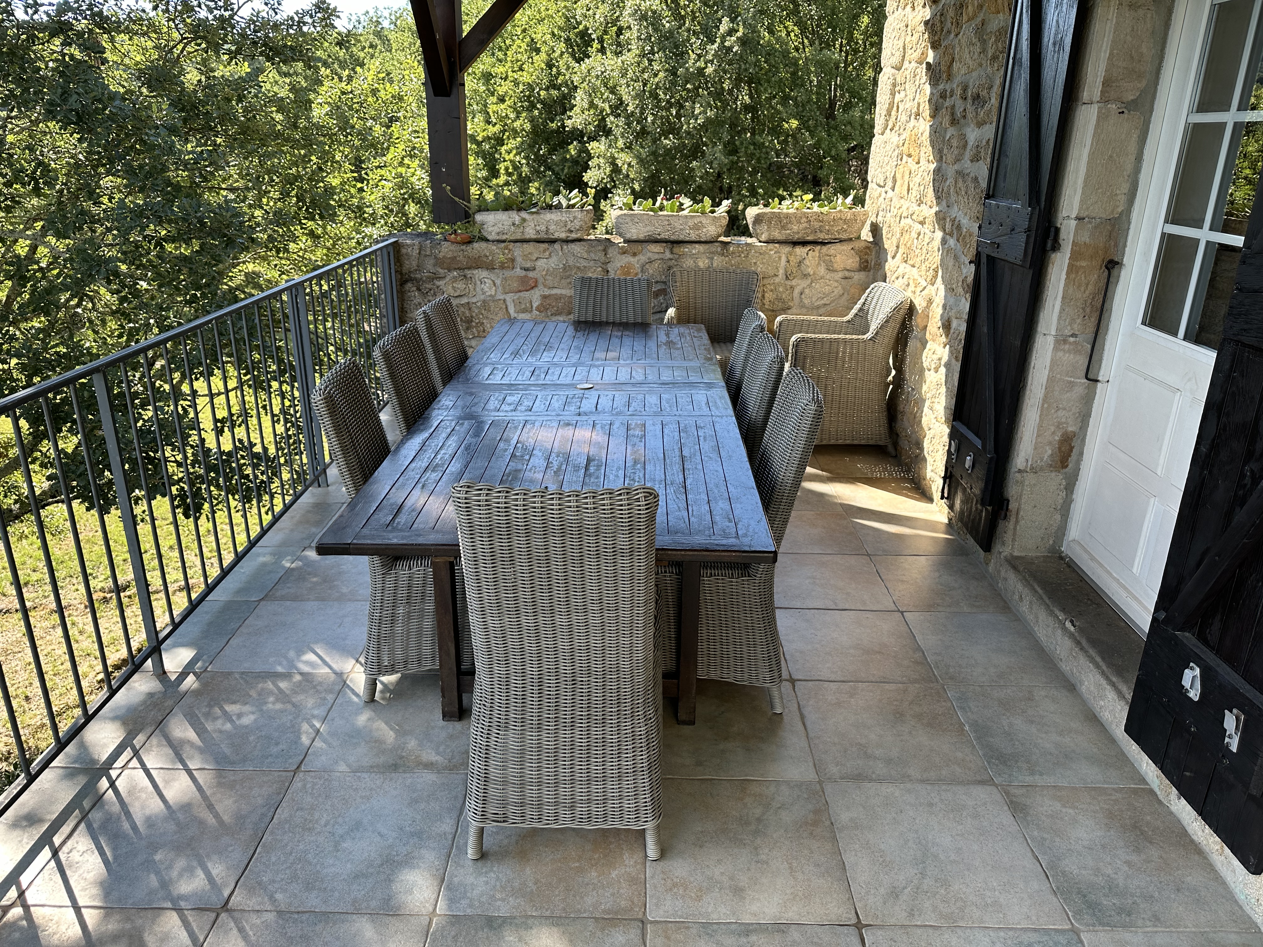 Au premier étage, un grand balcon avec une terrasse couverte qui donne directement sur la cuisine.